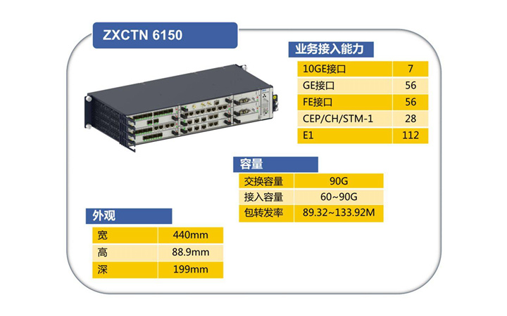 ZXCTN 6150(中興6150)最多提供9路10GE高速接口,56路GE(光/電)接口,支持10GE、GE、FE、STM-1、E1等類型接口。雙主控時支持6個業務處理槽位,單主控應用最大支持7個業務槽位,定位于大容量接入,2U高,199深,安裝于19寸標準機柜。